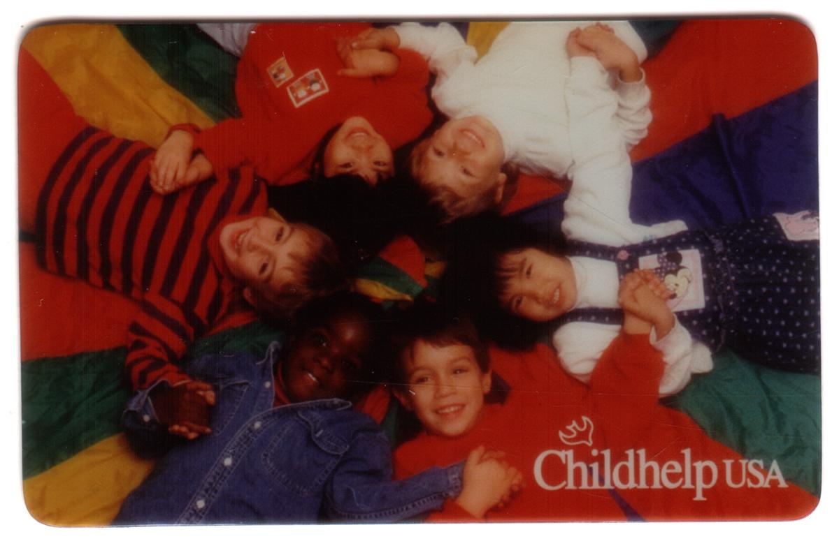 Additional elements on the card include a logo for ChildHelp USA and payment network icons, suggesting its use for telephone services. The layout integrates text and imagery clearly, ensuring the focus remains on the organization and its charitable efforts to assist victims of child abuse.