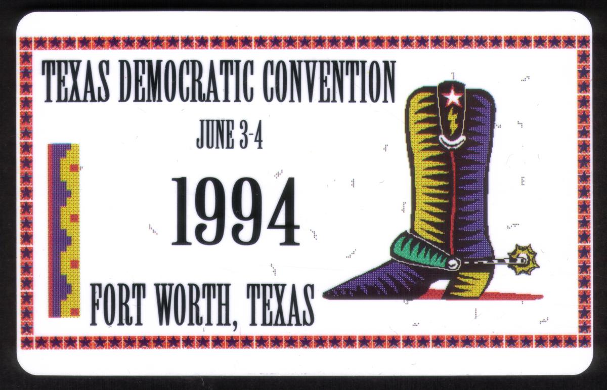 This collectible card commemorates the 1994 Texas Democratic Convention held in Fort Worth, Texas, in June 1994. The card features an artistic design prominently displaying a classic western cowboy boot with metal spurs, symbolizing Texas heritage and culture. The style of the artwork blends traditional western imagery with political themes reflecting the Democratic Party’s presence at the convention.
