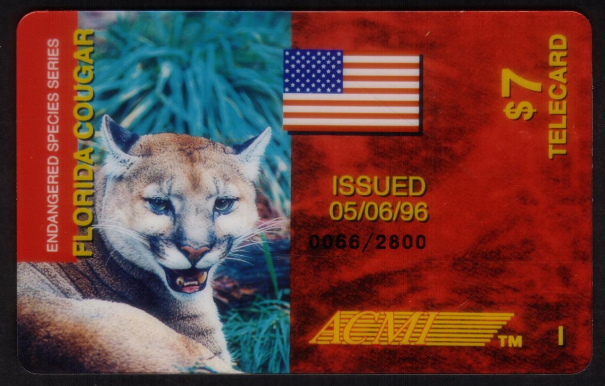 Additional text on the card reads “USA Flag – ACMI” and indicates a value of $7, implying this is a collectible phone card. The themes on the card include wildlife, cougars, cats, American flags, and felines, aligning with the national and conservation focus of the design. The overall presentation is vivid and patriotic, celebrating the American wildlife heritage and the protection of endangered species.
