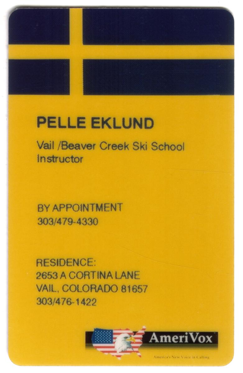 The card includes the AmeriVox logo, indicating the issuing company. Text on the card clearly identifies Pelle Eklund by name and his role as a ski school instructor at these well-known Colorado ski locations. The design integrates elements representing skiing and winter sports, emphasizing the connection to the Colorado ski schools.