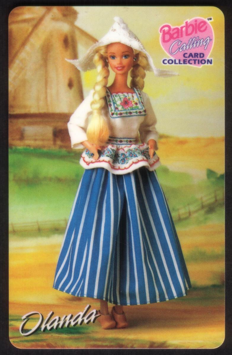 This collectible phone card features a Barbie doll dressed in the traditional native dress of Holland, Netherlands. The Barbie wears a white blouse with puffed sleeves and an intricately embroidered apron featuring floral designs over a blue skirt with vertical white stripes. She is also adorned with a white lace bonnet and wooden shoes, reflecting classic Dutch attire. Her long blonde hair is styled into two thick braids, complementing the traditional look.