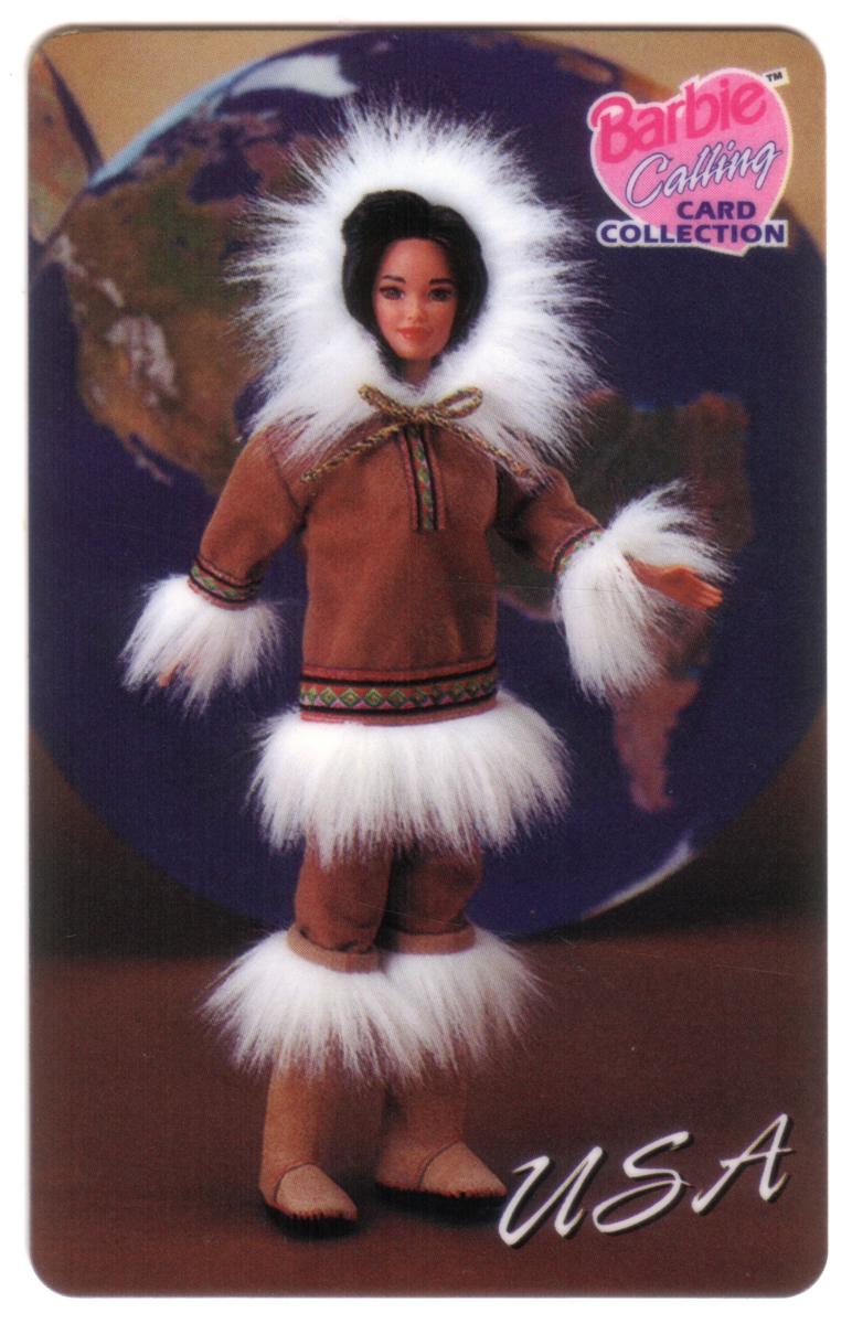 This collectible phone card features Eskimo Barbie dressed in a traditional Native dress representing Alaska, United States. The Barbie doll wears a tan-colored parka accented with white fur trim around the hood, cuffs, and hem, along with matching pants that have fur-lined boots. The parka includes decorative patterned bands near the waist and cuffs, and a brown bow tied at the neck.