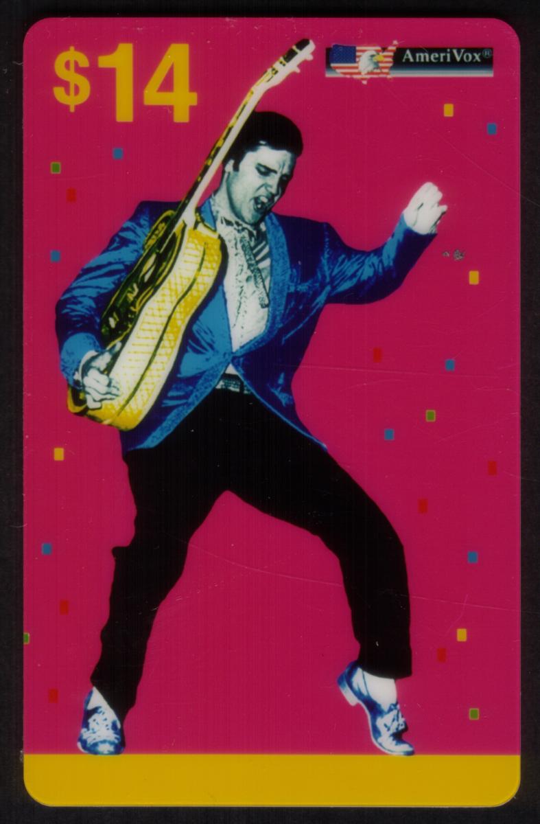 The card has a yellow "$14" value prominently displayed in the top left corner. The top right corner features a small American flag alongside the AmeriVox logo, indicating the card’s issuing company. This card captures the essence of Elvis Presley’s showmanship and classic rock and roll energy.