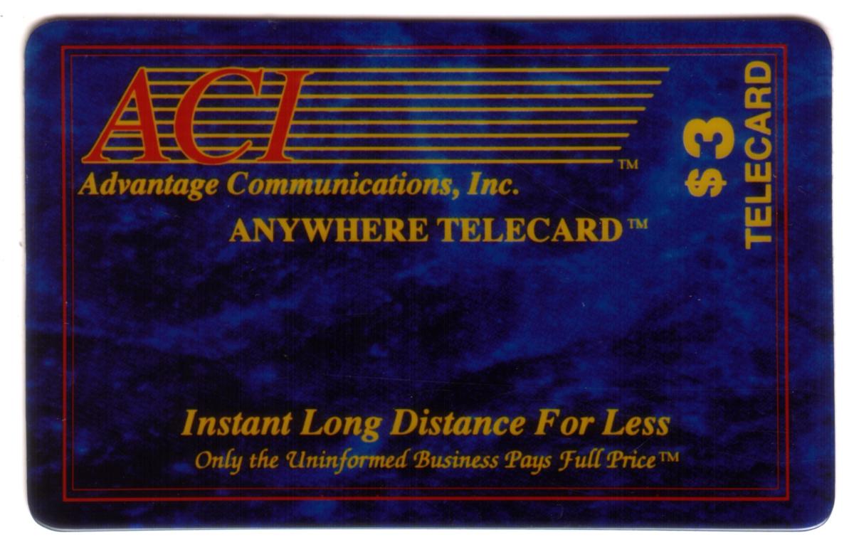 This collectible telecard features a deep blue marbled background with gold and red trim lines around the edges. The top left corner prominently displays the logo "ACI," which stands for Advantage Communications, Inc. Below the logo is the text "ANYWHERE TELECARDā¢," indicating it is a prepaid phone card designed for long-distance calls.