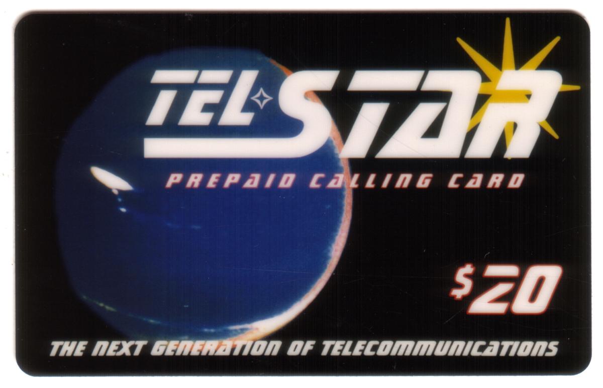 Futuristic prepaid calling card featuring a black background, blue globe, TELSTAR logo with starburst, $20 value, and sleek modern design for global connectivity.