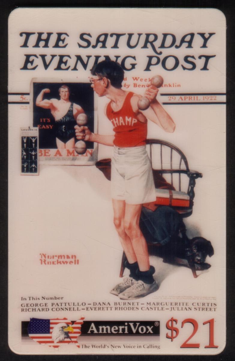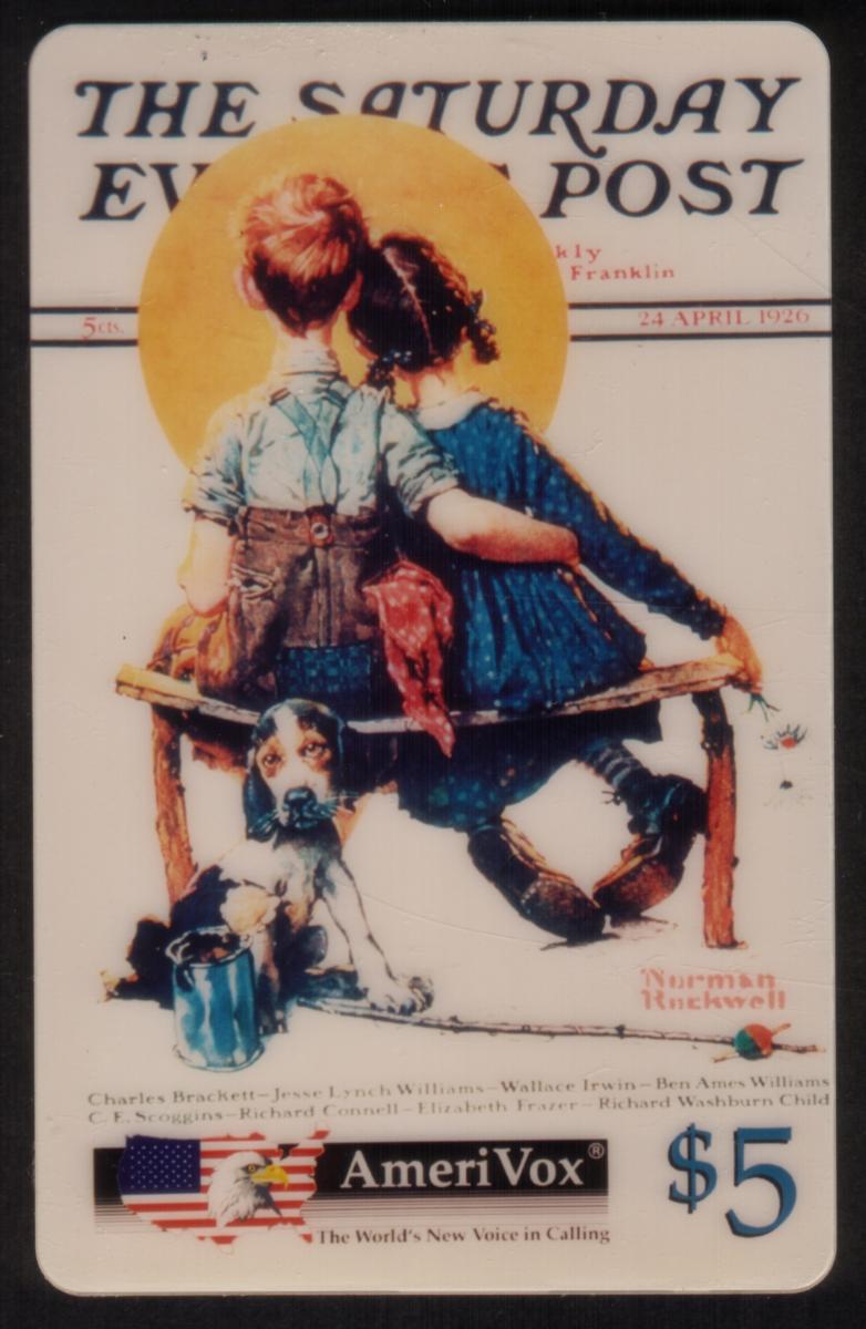 Each card bears the AmeriVox logo at the bottom, along with the tagline "The World's New Voice in Calling." The values on the cards vary, with four showing a $5 denomination and one displaying a $21 denomination. The presence of dates on the artwork reflects the original publication dates of the covers by The Saturday Evening Post, spanning from 1919 to 1939. Norman Rockwell’s signature is clearly visible on each card, tying directly to his famous illustrations.