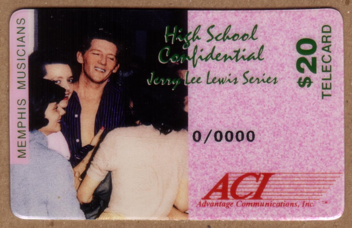 At the bottom right corner, the logo and name "ACI" for Advantage Communications, Inc. appears in red, indicating the card’s telecommunications provider. A serial number "0/0000" is printed in black near the center right. This card belongs to the Jerry Lee Lewis "High School Confidential" series, celebrating Americana and 1950s rock and roll music culture.