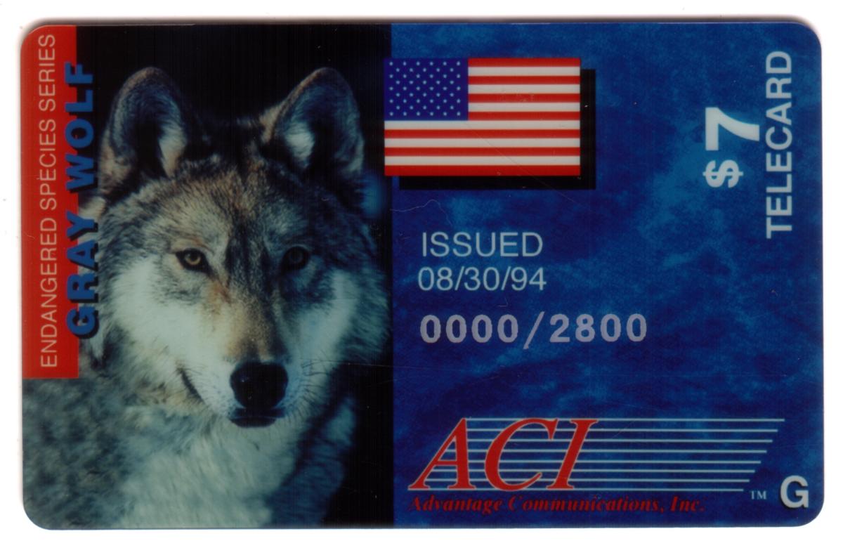 Collectible wildlife phone card featuring a detailed gray wolf with piercing yellow eyes, part of the Endangered Species Series, issued in 1994.