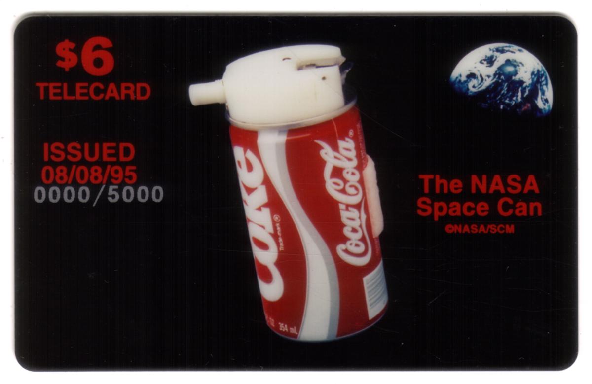 This collectible $6 telecard, issued on August 8, 1995, features a detailed image of the NASA Space Can with the iconic Coca-Cola logo displayed prominently. The can is depicted floating against a black background, emphasizing its unique design as a specially engineered container for space use. The image includes the classic red and white Coca-Cola branding with "Coke" text visible, highlighting the collaboration between NASA and Coca-Cola in space exploration and aeronautics.