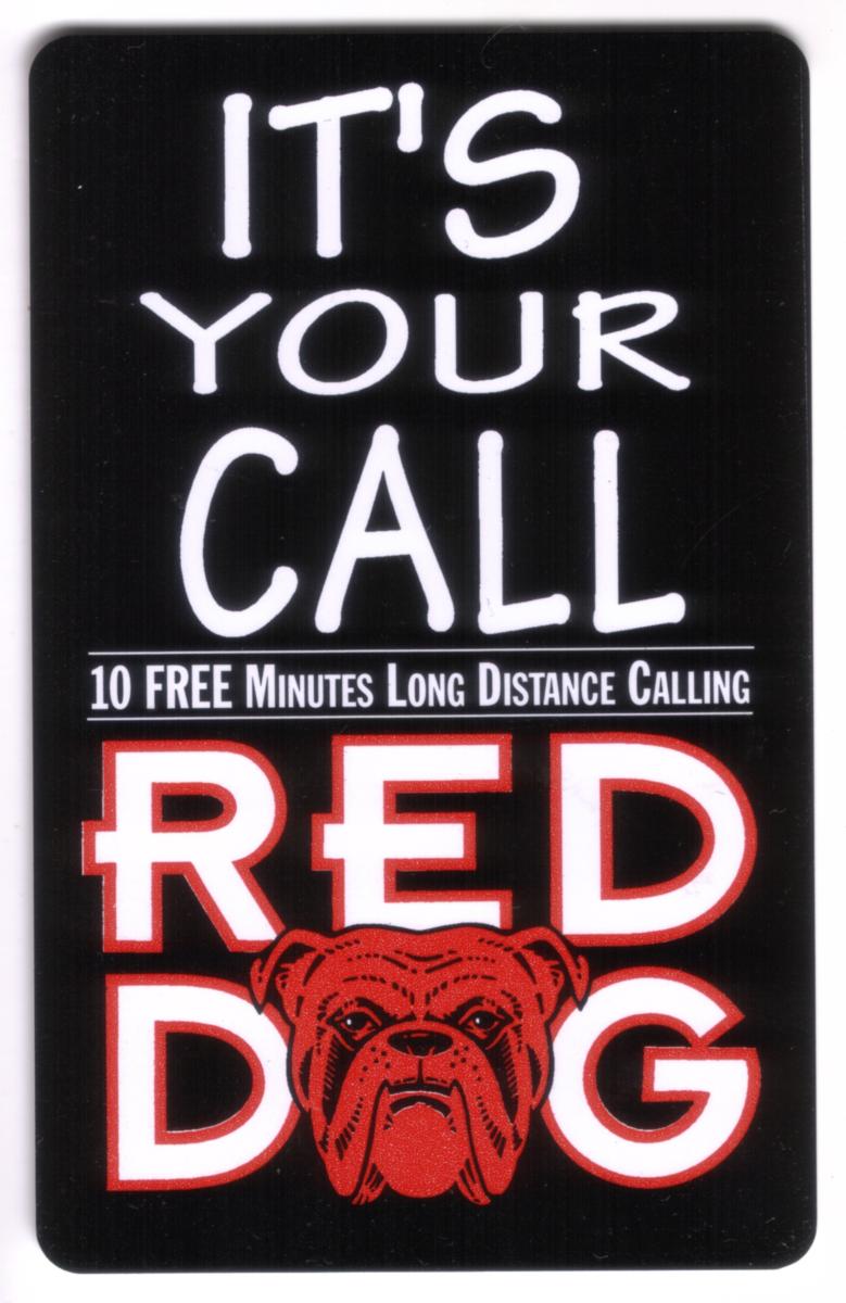 This card combines telecommunications with advertising, offering both functional calling minutes and distinctive branded imagery centered on Red Dog Beer.