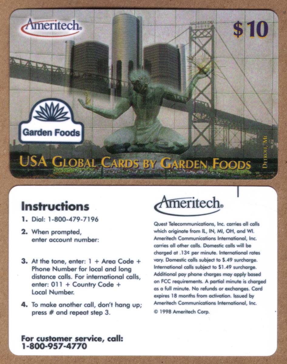 The card carries the text "Garden Foods Promo Detroit Landmarks Ambassador Bridge, Etc SPECIMEN Ameritech," indicating its promotional nature connected to Ameritech, a telecommunications company. The card is thin and made of plastic, designed for collectible purposes.
