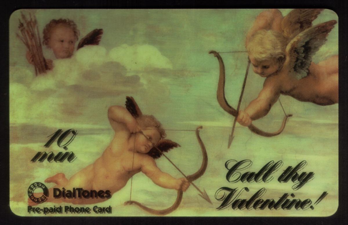 The card includes the printed text "DialTones: 10m Call Thy Valentine!" indicating a prepaid phone service with a value of 10 minutes. The branding involves MTS/InComm, companies known for interactive marketing solutions and prepaid phone cards. The overall design and text clearly relate to Valentine’s Day and intimate, romantic communication conveyed through the imagery of bows, arrows, and cherubic figures.