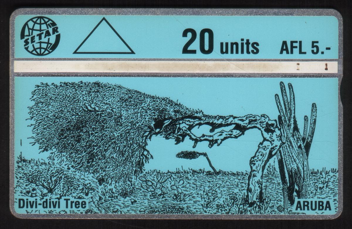 This collectible has been officially used, as indicated in the keywords, making it a valuable item for phone card collectors. The detailed depiction of the Divi-divi tree highlights a cultural icon of Aruba, combining an attractive natural scene with functional telephony branding from Landis & Gyr.