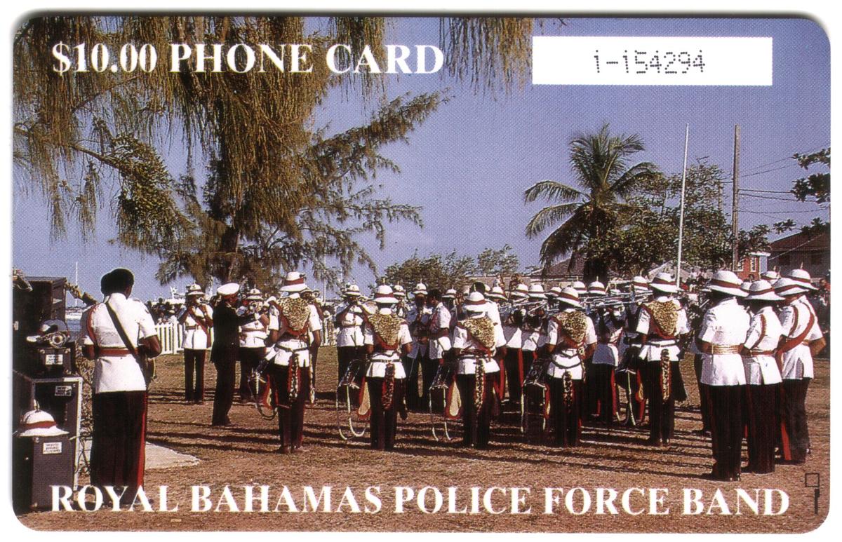 This collectible phone card from the Bahamas features a vibrant photographic image of the Royal Bahamas Police Force Band. The card vividly captures the band members dressed in their official uniforms, arranged in a formal setting. Each musician holds a different musical instrument, showcasing the variety of instruments used by the band. The scene reflects the ceremonial and musical traditions of the Royal Bahamas Police Force.