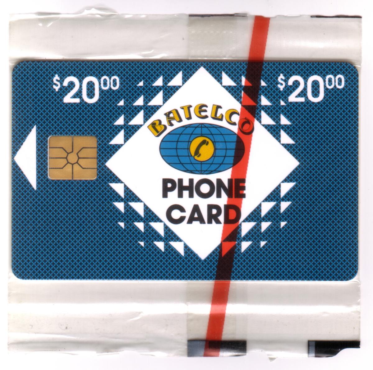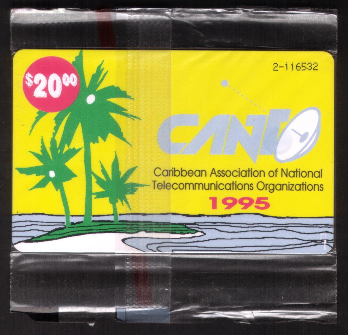 This smart card is issued by Batelco for use in the Bahamas and manufactured by Gemplus. It is a collectible phone chip card associated with the 1995 CANTO Caribbean Association show. The design emphasizes telecommunications through the satellite imagery while showcasing the tropical character of the Bahamas with the palm trees and island.