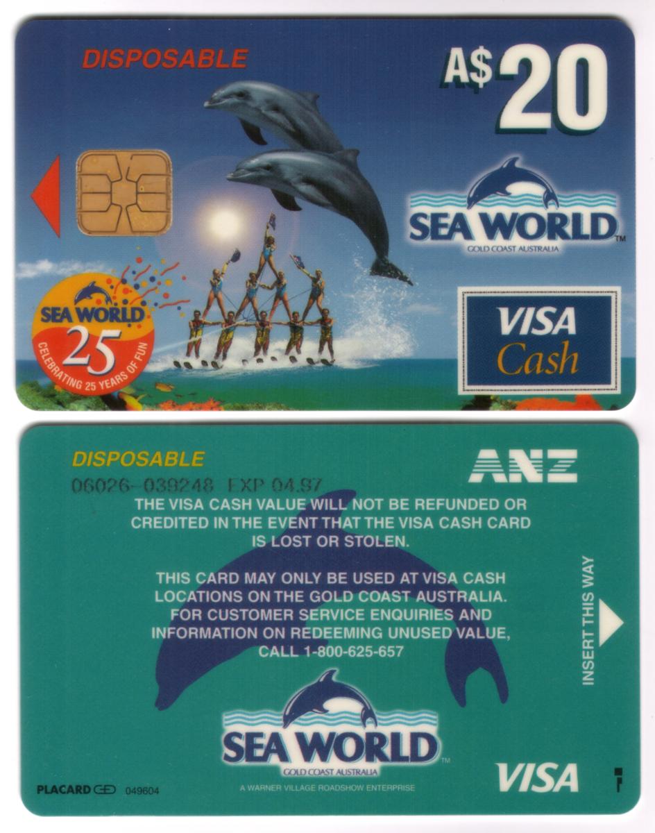 Celebrate Sea World''s 25th with this vintage A$20 Visa Cash chip card featuring aquatic scenes and water sports on the Gold Coast, highlighting early secure payment tech.