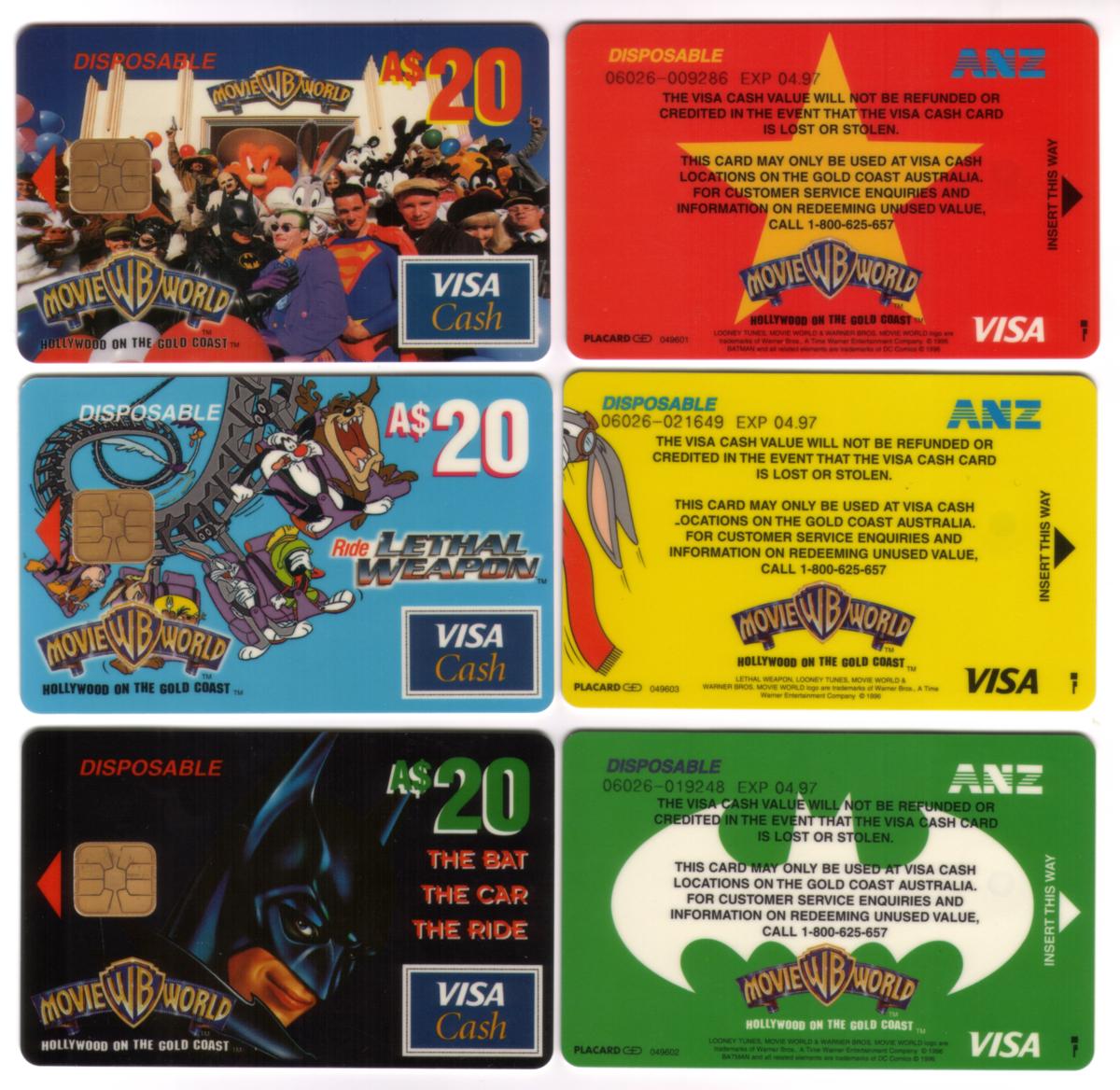 $60. Warner Bros Movie World VISA Cash Chip Card Set of 3 Exp 04/97