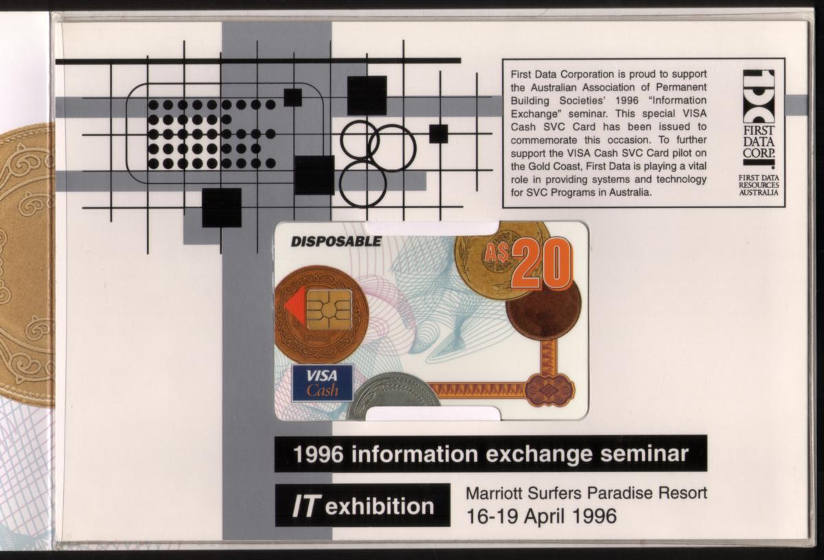 This collectible card represents a significant milestone in electronic banking in Australia, specifically tied to a noted industry exhibition and seminar in 1996. Its production by First Data Corporation marks it as an example of early stored value banking cards, demonstrating the integration of chip technology with financial products in the Australian market.