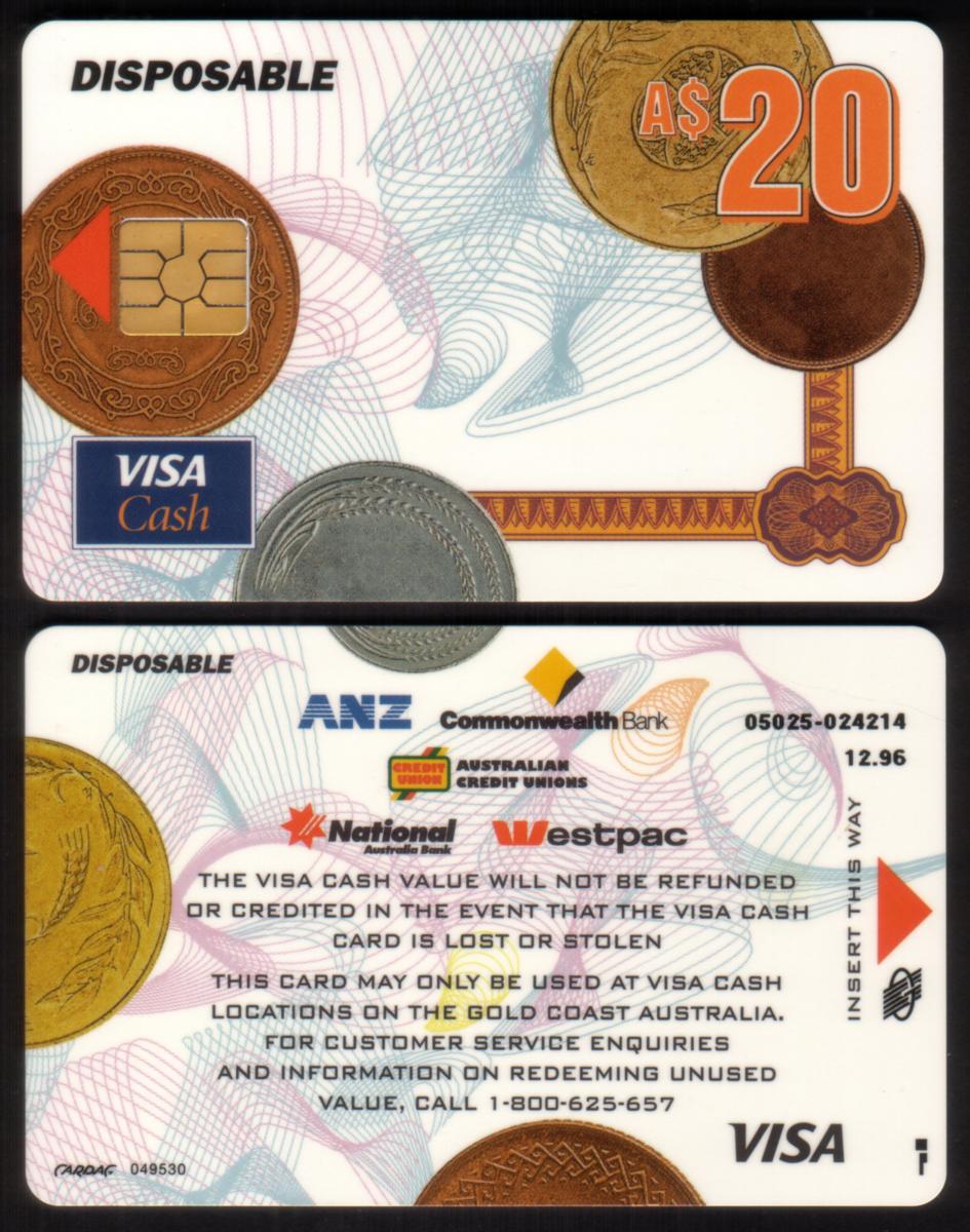 A 1996 Australian stored value card from an IT exhibition, featuring coin motifs and VISA Cash branding, highlighting early electronic payment innovations.
