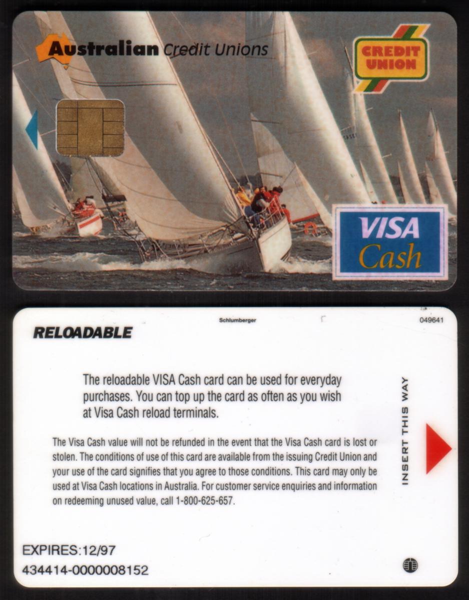 The entire card layout is typical of a stored value bank card used for financial transactions. The expiration date is clearly printed as "Exp 12/97," marking its period of validity. The combination of the "Visa Cash" branding with the sailing imagery connects the card's functionality as a reloadable stored value card with the specific theme reflecting Australian credit unions and sailing.