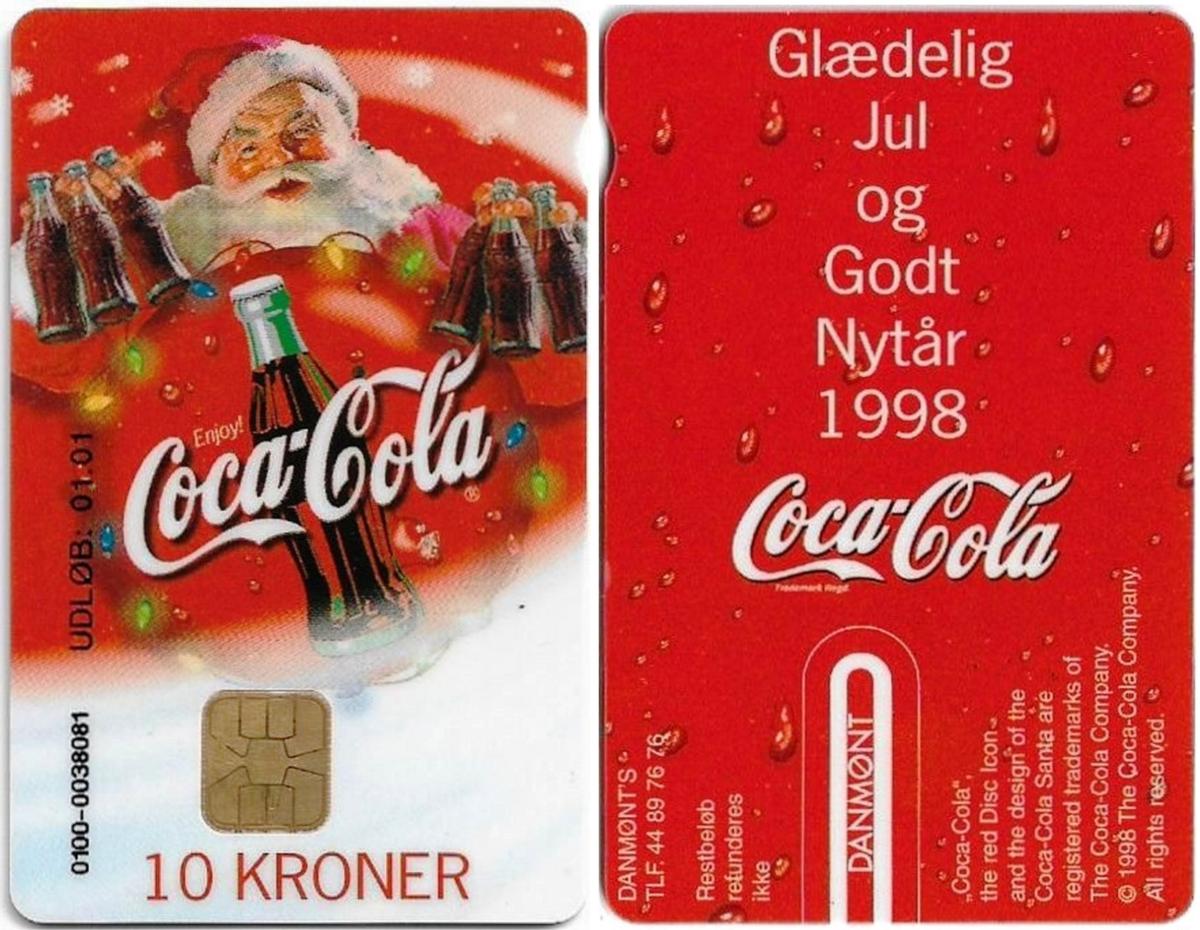 This collectible chip card features a festive 1998 Coca-Cola Christmas design from Denmark. The front artwork prominently displays a traditional Coca-Cola Santa Claus holding a glass bottle of Coke, surrounded by multiple classic Coke bottles arranged in a cheerful holiday setting. The iconic red and white colors of Coca-Cola dominate the card, enhancing its seasonal and brand appeal.