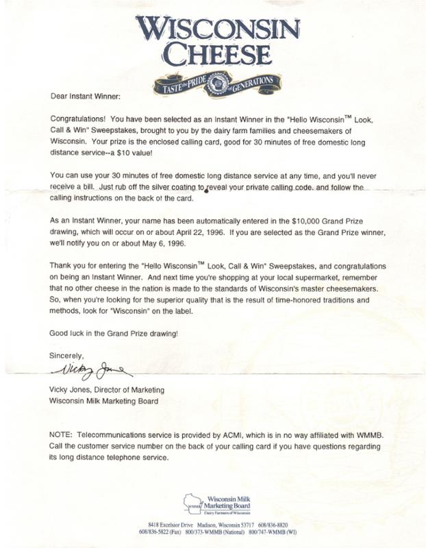 60m Wisconsin Cheese Promo Sweepstakes Card 'Say Hello..' (w/ Letter)